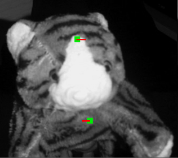 Here the real deformation (on left of last picture) applied is unknown. The algorithm runed within a couple of minutes until convergence. Here many pixels have been incorrectly labeled, but the overal deformation map shows indeed that the upper part moved right (bright means it moved right), and the bottom part moved left (dark means it moved left).